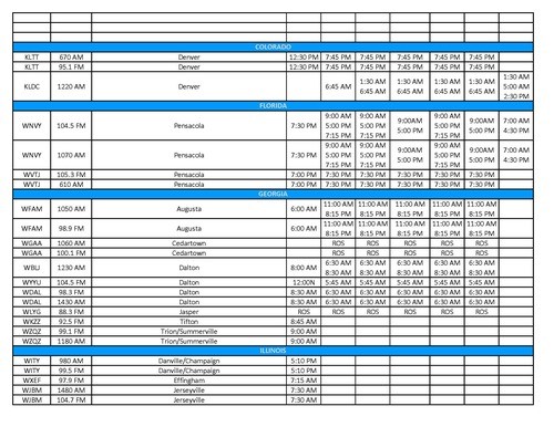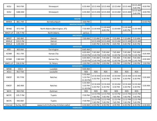 - Columbus/Tupelo/Starksville, MS (WCBI, MyTV-4.2, Sundays @ 7:30 AM)