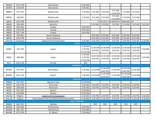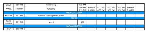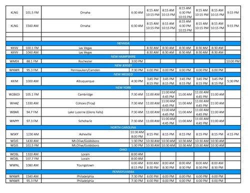 - Bluefield/Beckley W. VA / Tazewell, VA (WVNS, FOX-59.2, Sundays @ 8:00 AM)